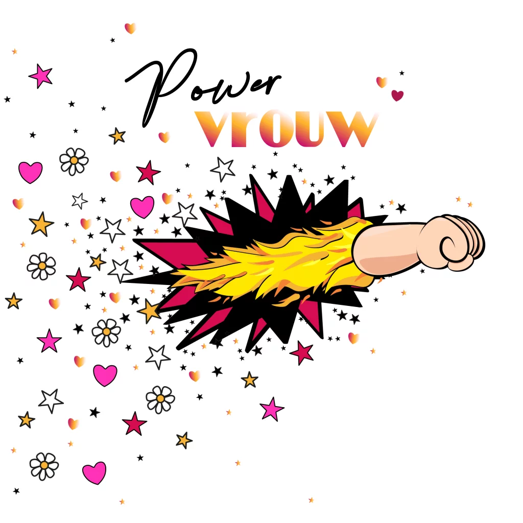 Wenskaart - Power vrouw met een stoere illustratie vuist met vlammen en vele hartjes, sterren en bloemen.