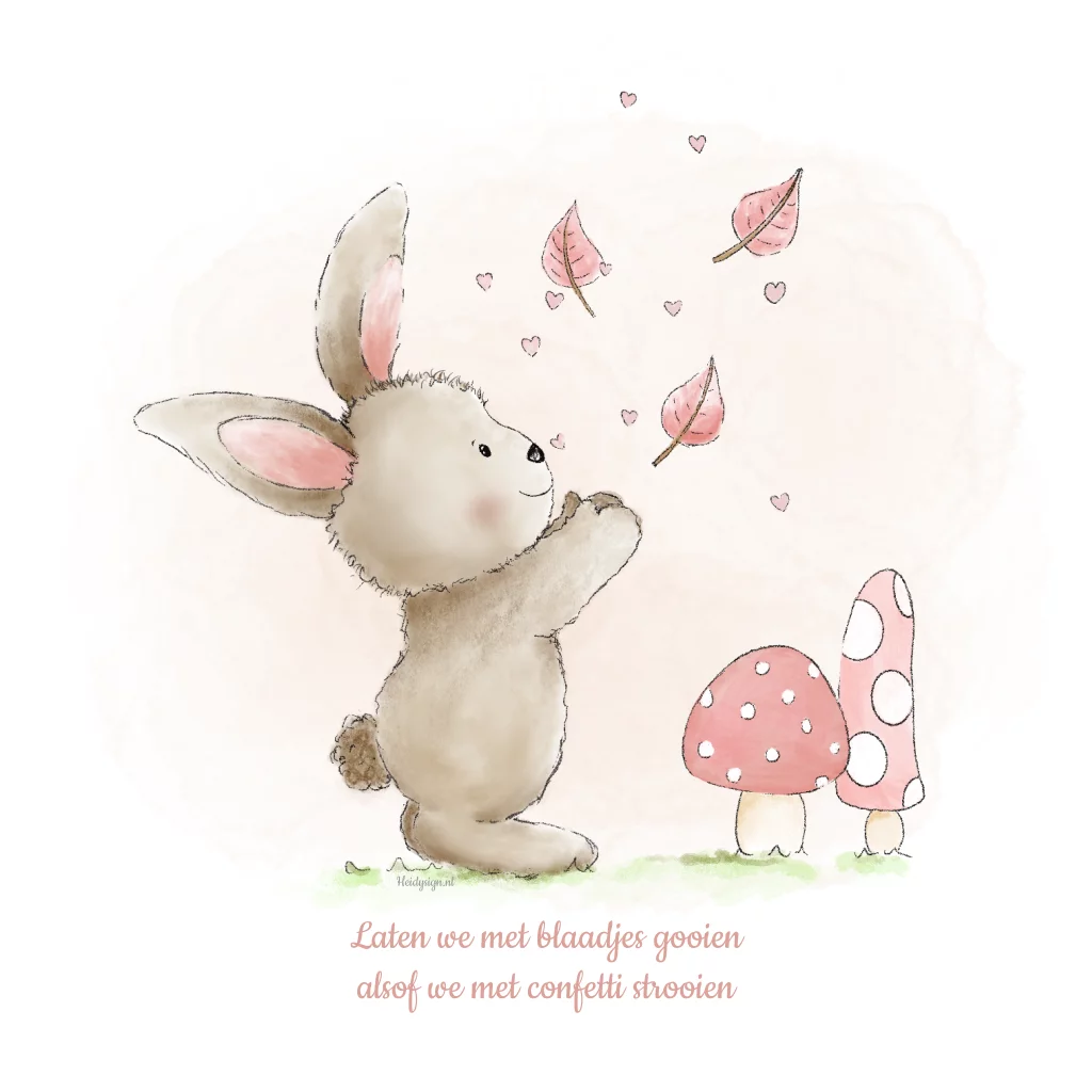 Breng een glimlach met deze vrolijke wenskaart, waarop een schattig konijntje te zien is dat blaadjes in de lucht gooit, alsof het confetti is. De speelse tekst 'Laten we met blaadjes gooien, alsof we met confetti strooien' straalt positiviteit uit. Pas de tekst aan met je eigen woorden en laat de kaart direct naar iemand verzenden om hun dag op te fleuren. Perfect voor een herfstige groet vol blijdschap!