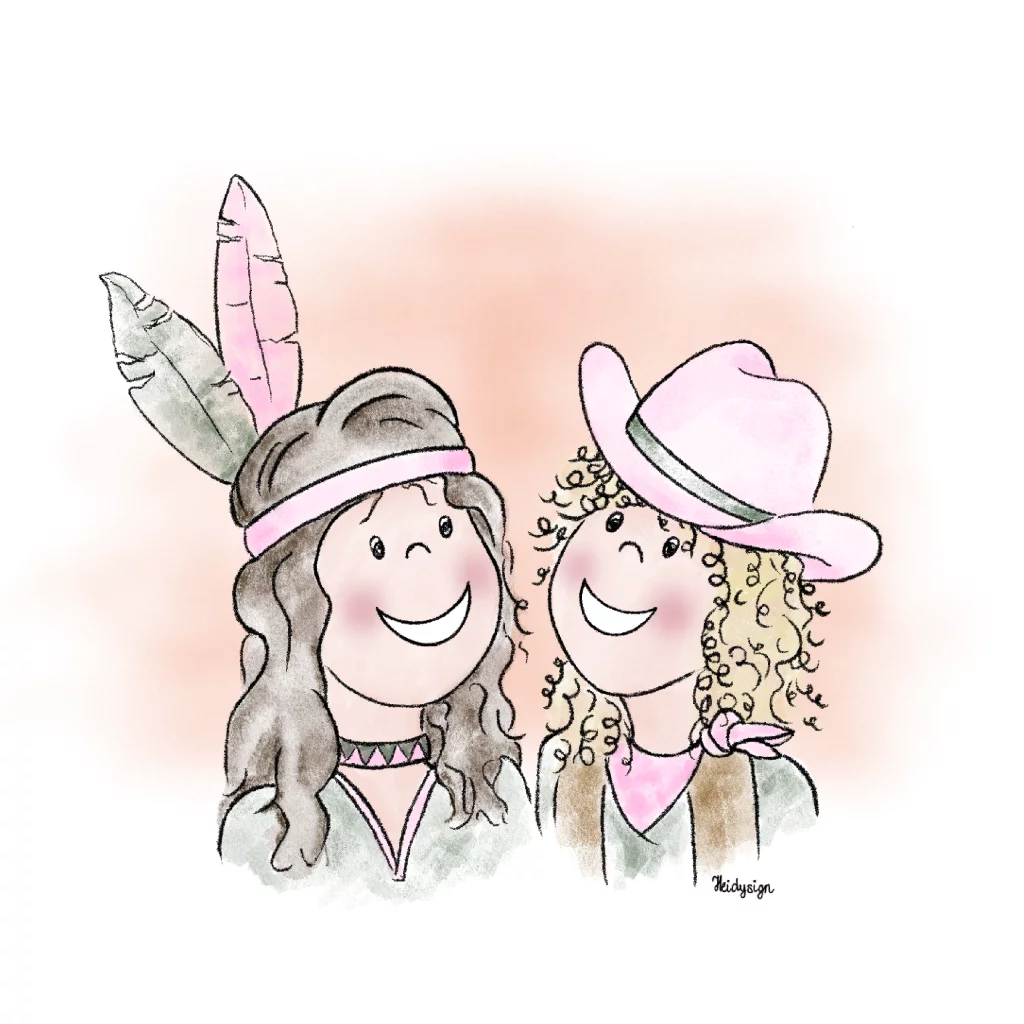 Deze speelse wenskaart toont een schattige tekening van twee volwassen vrouwen, verkleed als een cowgirl en een indiaan. In een vriendelijke en vrolijke cartoon-stijl met zachte pasteltinten, straalt de kaart puur plezier uit!