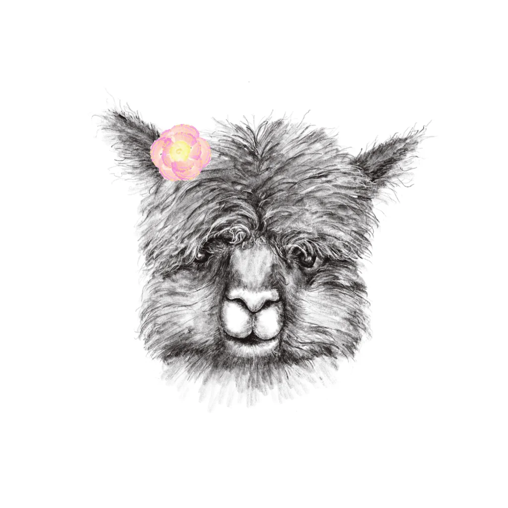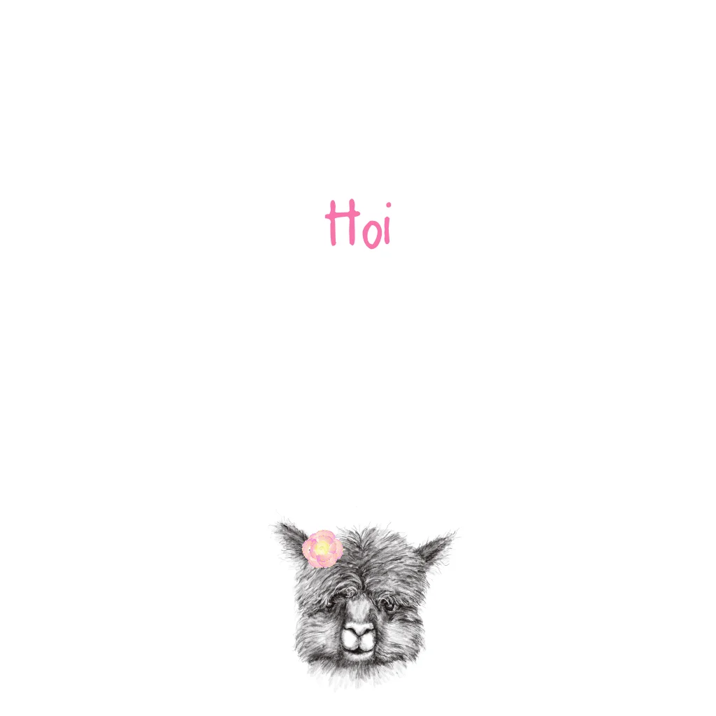 Wenskaart om zomaar te versturen. Grappige kaart met een potloodtekening van een alpaca met een bloem achter zijn oor. Je kunt deze bloem verwijderen en een eigen tekst toevoegen aan de kaart.