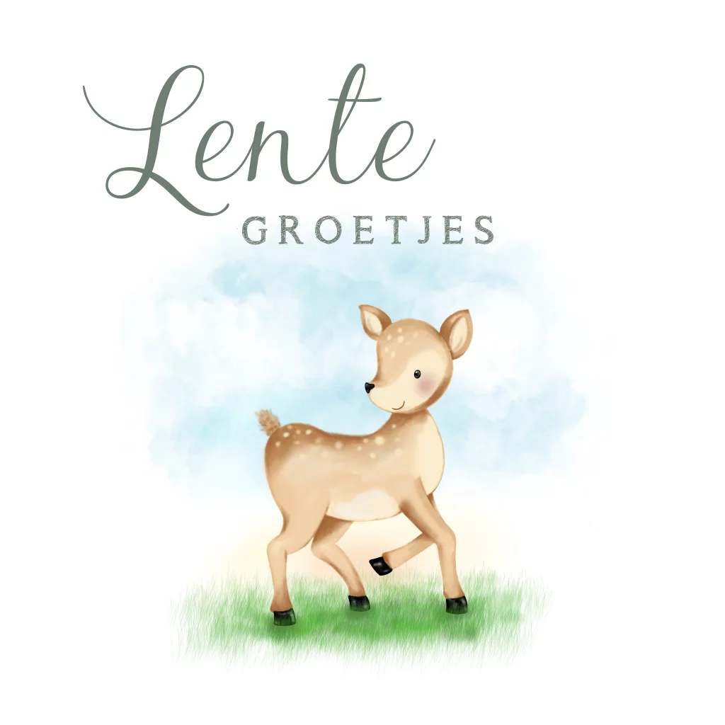 Wenskaart. Een lentekaart om zomaar te versturen met een tekening van een lief baby hertje in de wei. De tekst: 'Lente groetjes" kun je eenvoudig aanpassen.