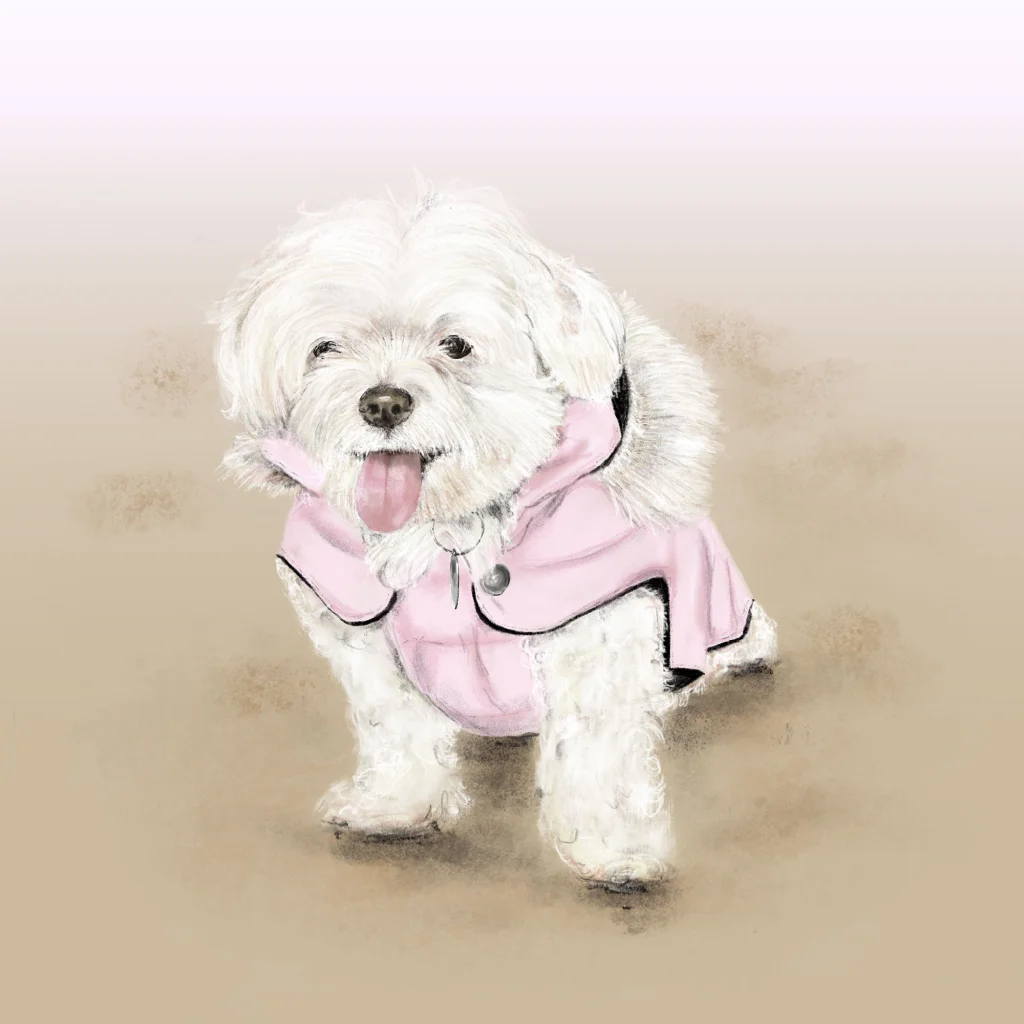 Wenskaart met een tekening van een lief wit hondje met een roze jasje. Leuke kaart om zomaar te versturen.