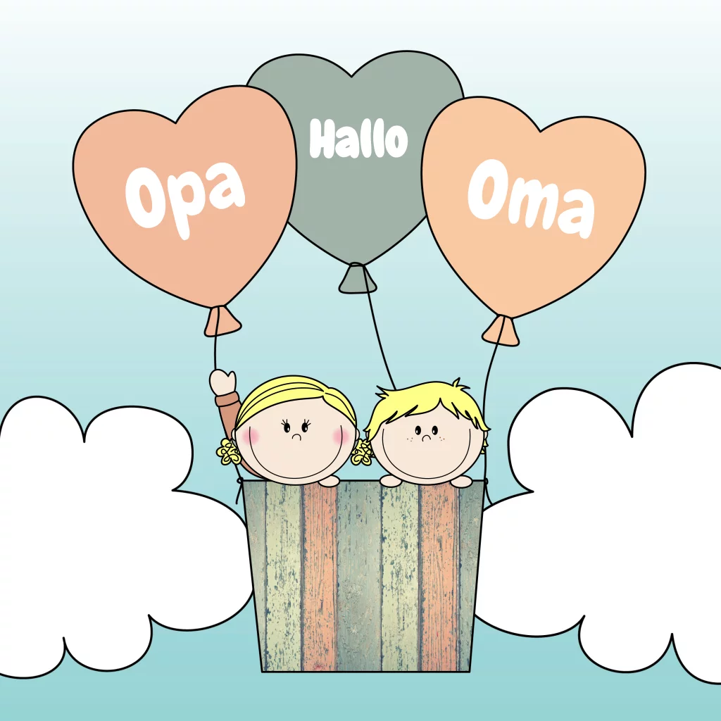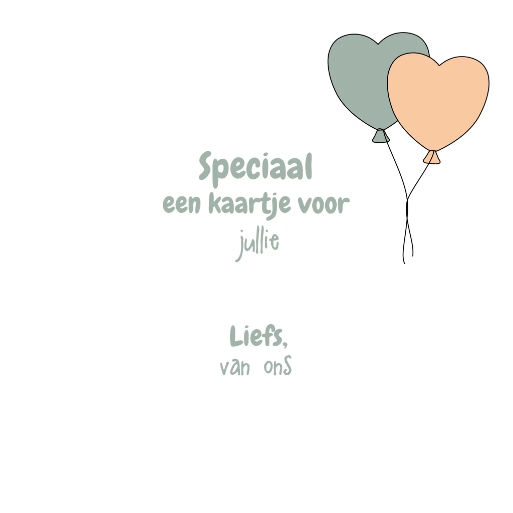 Zomaar. Een kaart om zomaar te versturen met een illustratie van 2 vrolijke kindjes in een luchtballon met hartjes. Leuke kaart voor opa en oma. De teksten kun je eenvoudig aanpassen.