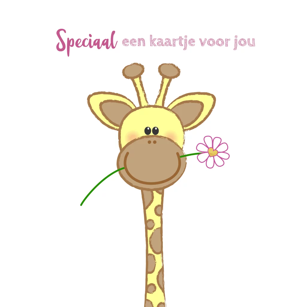 Een schattig kaartje om zomaar te versturen met een illustratie van een lief girafje met een bloem in zijn mond.
