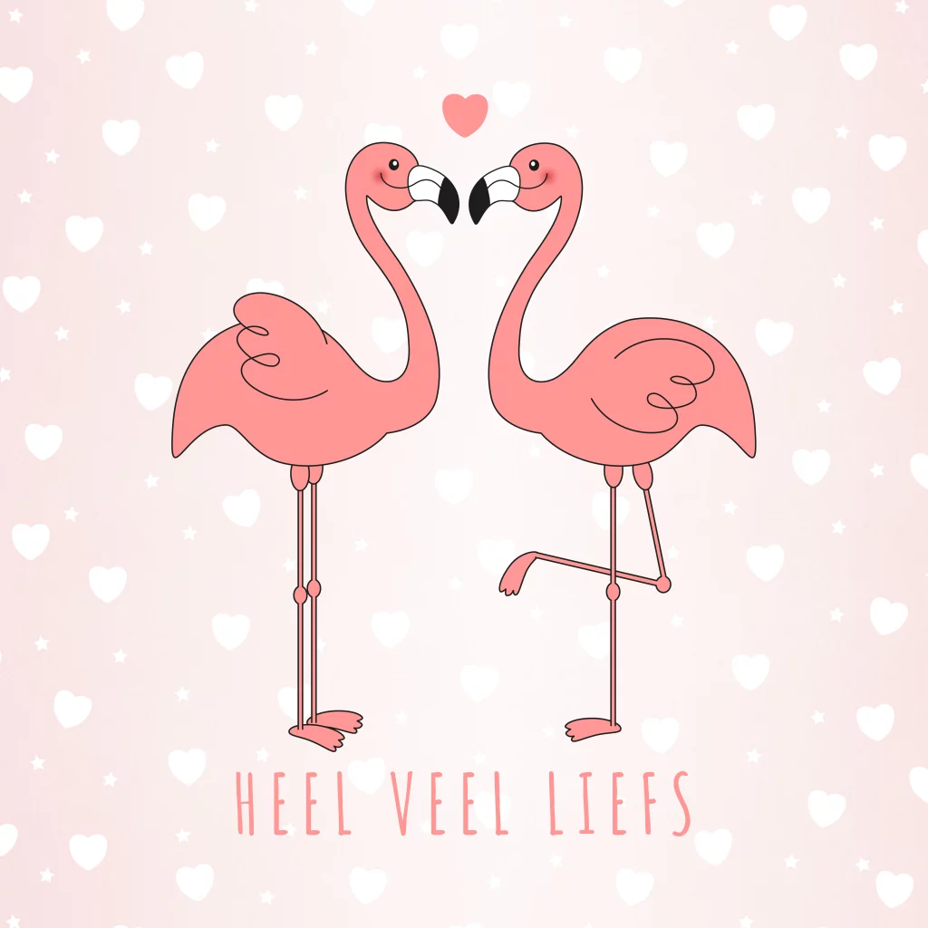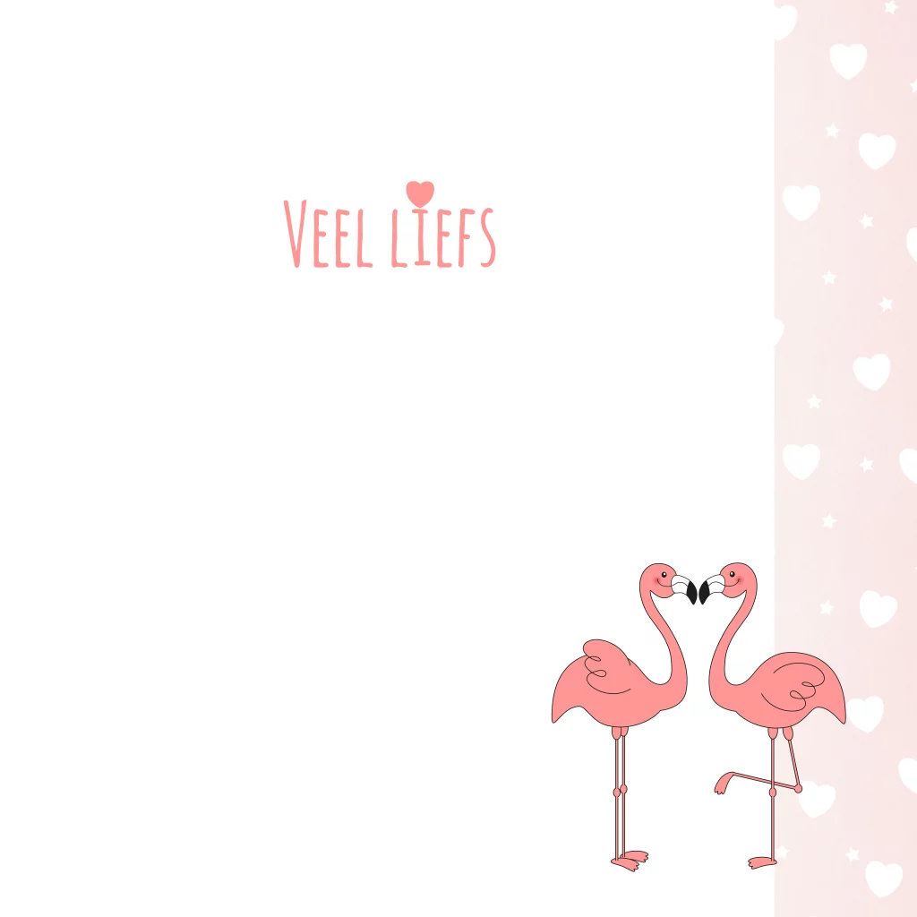 Lief kaartje om zomaar te versturen. Deze kaart heeft een zacht roze achtergrond met vele hartjes en sterren. En een illustratie van 2 schattige flamingo's.